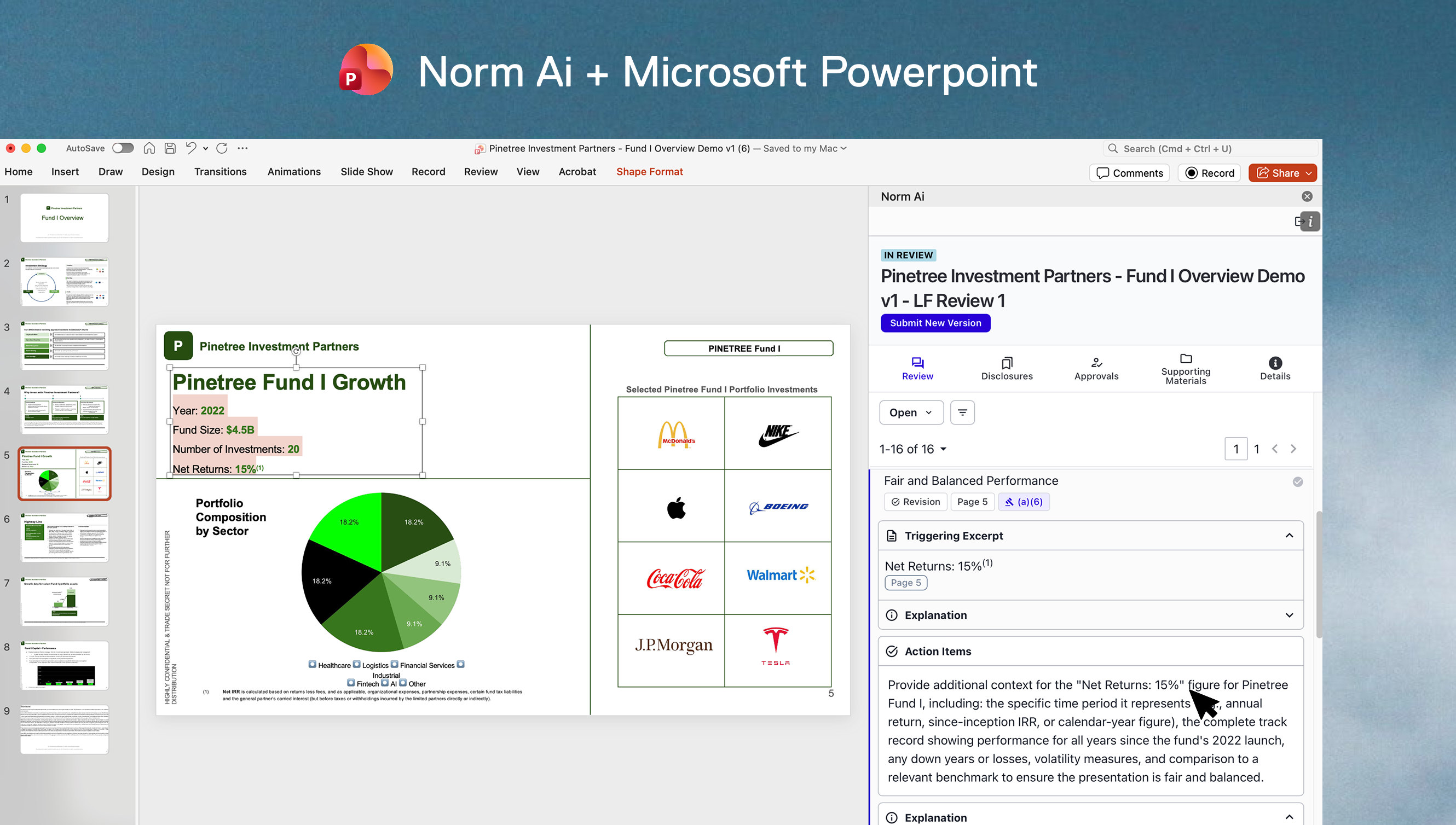 Within Microsoft Word and PowerPoint, teams can review, revise, and finalize content without leaving their existing workflows. Norm's AI agents evaluate material in place, identifying missing disclosures, unsupported claims, or policy conflicts, and explain their reasoning clearly, anchored directly to the relevant text or slide.